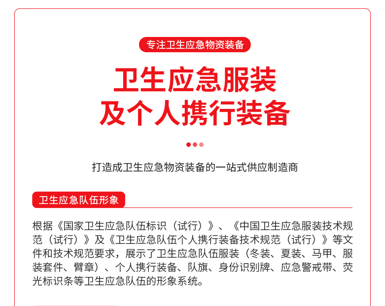 根據(jù)《國家衛(wèi)生應(yīng)急隊伍標(biāo)識(試行)》、《中國衛(wèi)生應(yīng)急服裝技術(shù)規(guī)范(試行)》及《衛(wèi) 生應(yīng)急隊伍個人攜行裝備技術(shù)規(guī)范(試行)》等文件和技術(shù)規(guī)范要求, 展示了衛(wèi)生應(yīng)急隊伍服裝(冬裝、夏裝、馬甲、服裝套件、臂章)、個人攜行裝備、隊旗、身份識別牌、應(yīng)急警戒帶、熒光標(biāo)識條等衛(wèi)生 應(yīng)急隊伍的形象系統(tǒng)。